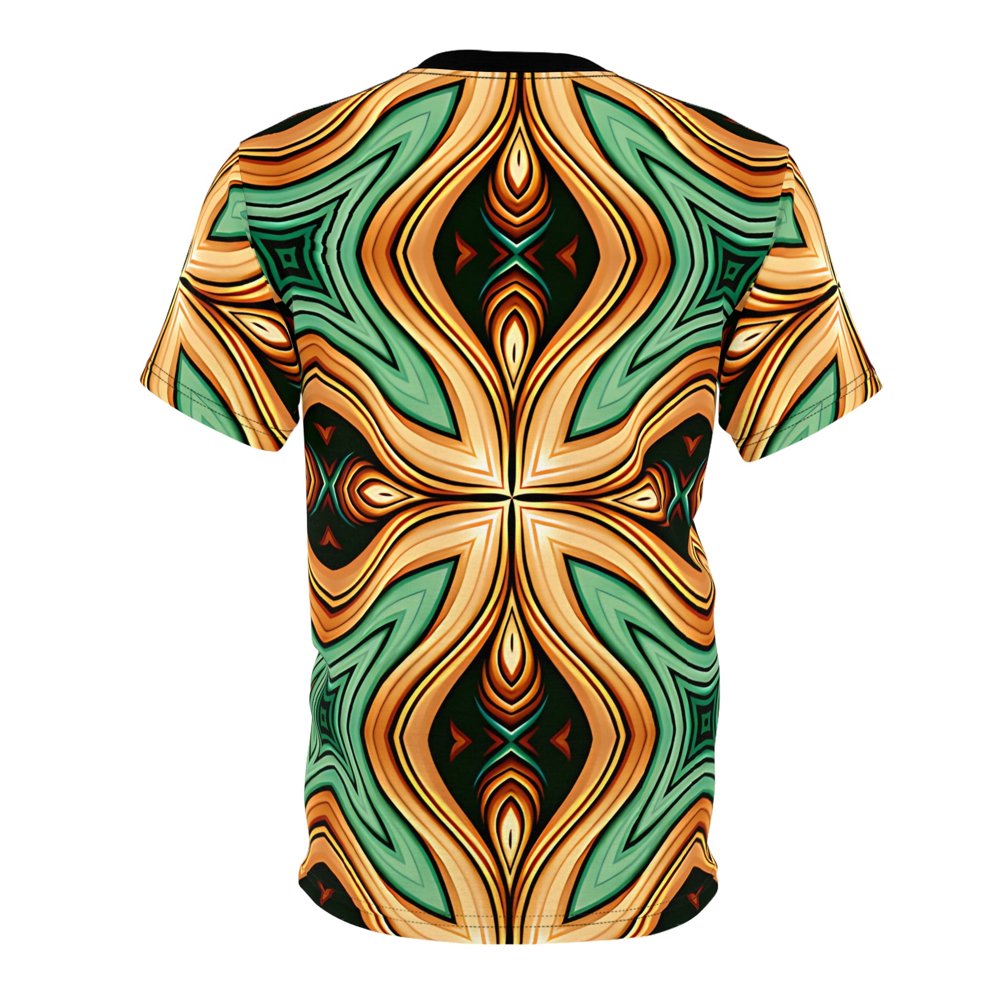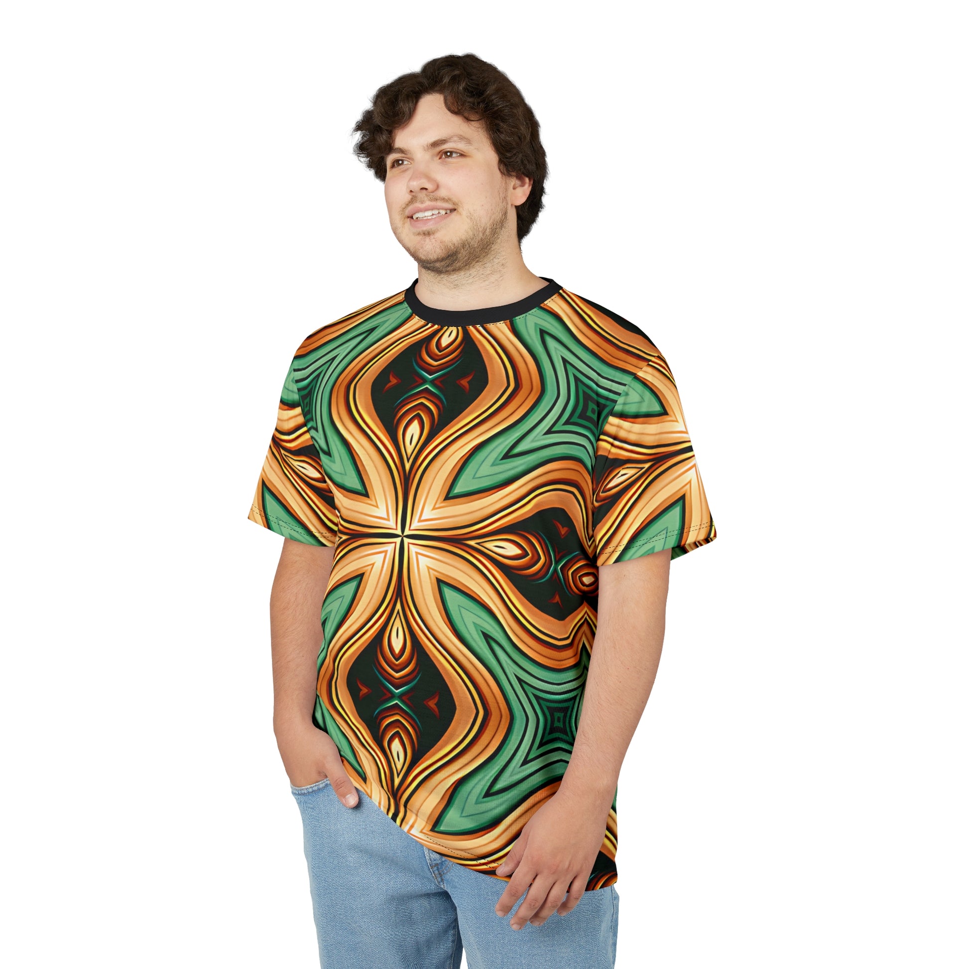 This all-over print tee brings a bold, retro-inspired mandala to your everyday rotation. The swirling petals and warm ochre, teal, and bronze tones feel like a sunlit vintage tapestry — vivid but grounded. Wear it when you want your outfit to be the conversation starter: layered under a denim jacket for city outings, paired with chinos for an artsy meet-up, or alone when the day calls for something lively and confident. The lightweight polyester keeps the colors bright and the fit easy, so you can move freely while the pattern stays crisp. It’s for people who love color, symmetry, and garments that read like wearable art.