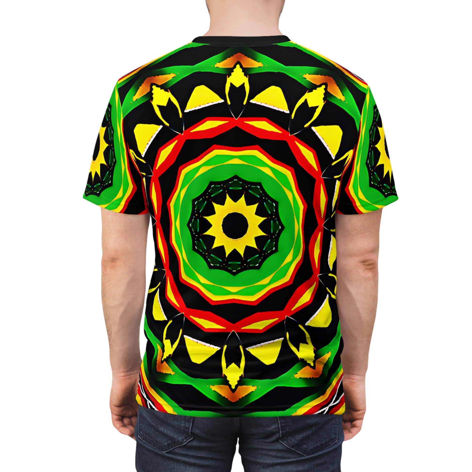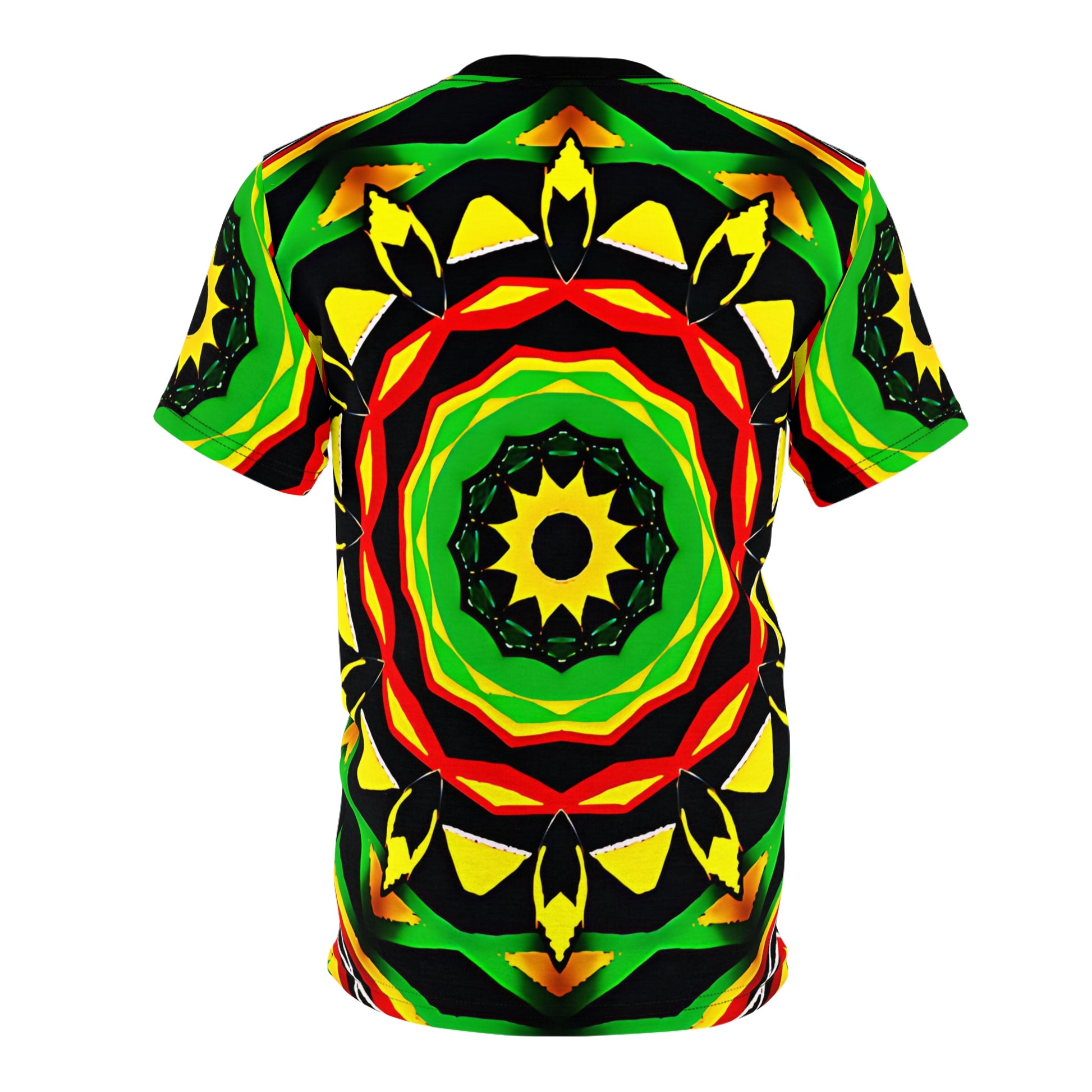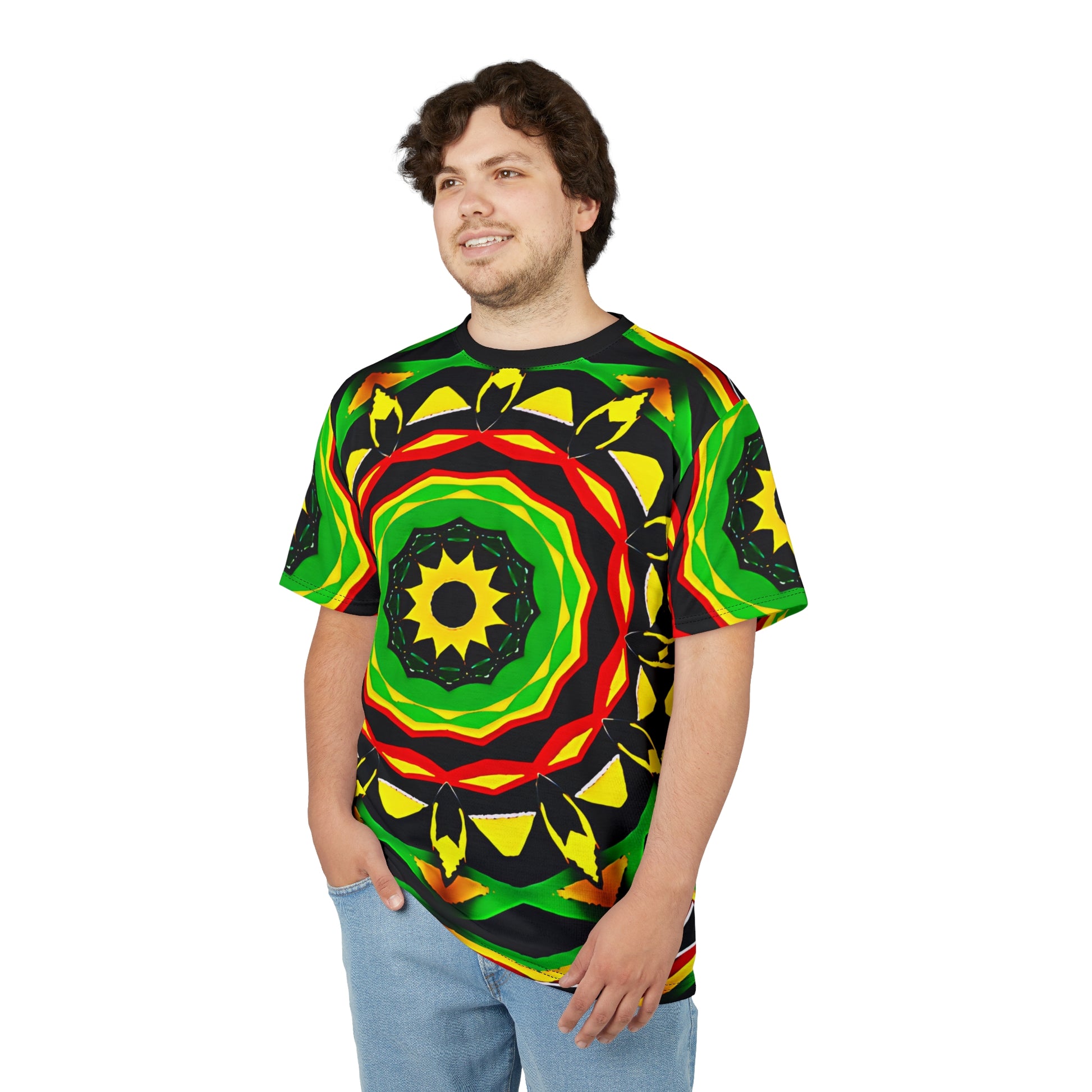 A vibrant, all-over print tee that feels like stepping into a sunlit festival breeze. Bold concentric patterns in green, yellow, red and black form a radiant mandala across the front and back, drawing the eye with rhythmic symmetry and energetic contrast. Lightweight polyester keeps the colors saturated and the fit crisp, whether you’re layering it under a jacket or wearing it solo on a warm afternoon. This shirt belongs in moments of movement — wandering market streets, late-night music sets, or relaxed hangouts where personality matters more than blending in. It sits comfortably on shoulders and keeps its shape, so the design stays striking wash after wash.