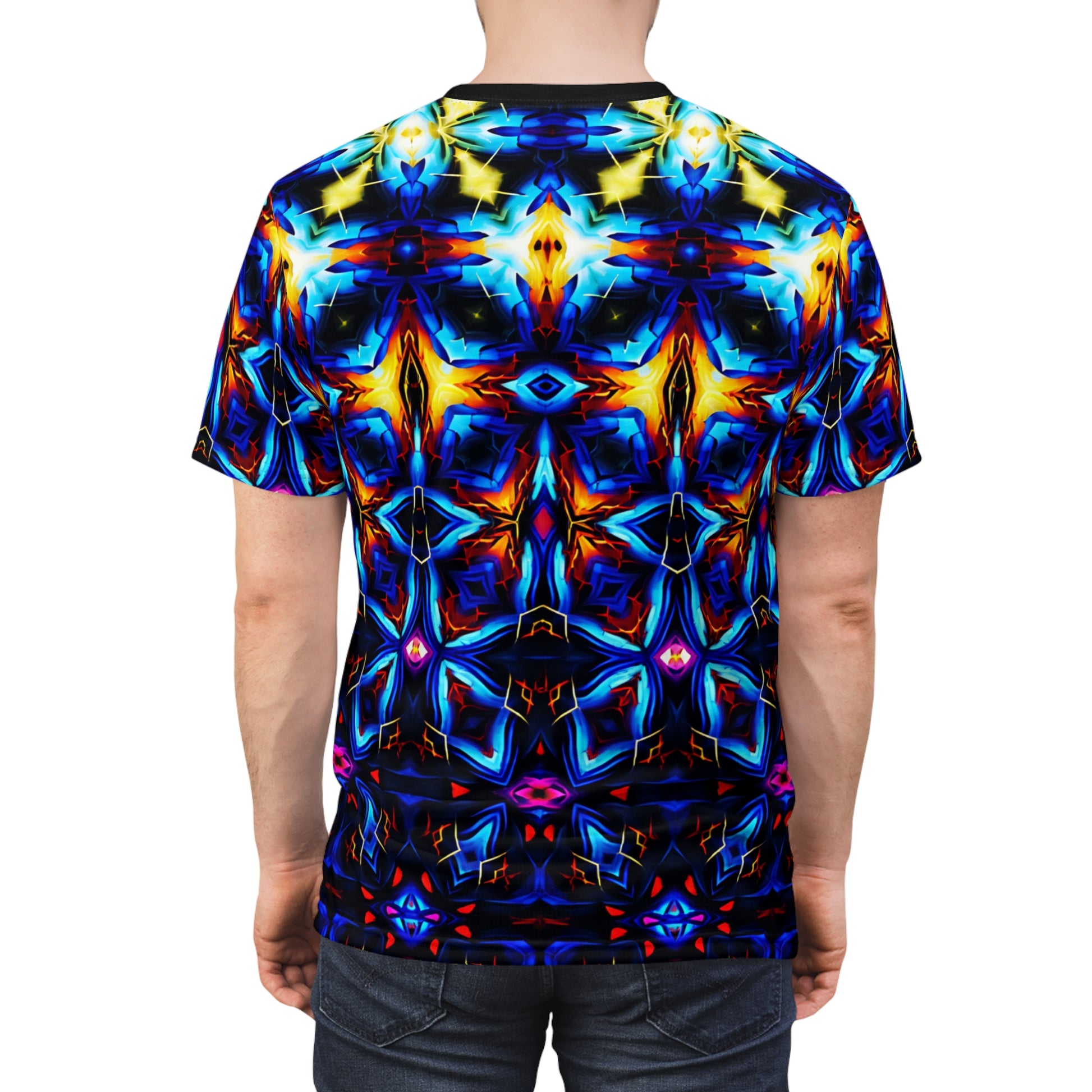 Dive into electric color and movement. This all-over print tee wraps you in a kaleidoscopic pattern of luminous blues, molten golds, and neon accents — like walking through a stained-glass corridor lit from within. Lightweight, quick-drying polyester keeps the design vivid and the fit comfortably true-to-size. The ribbed collar, shoulder tape and side seams hold shape through repeat wear, while the tagless finish sits quietly against your skin. Wear it to late-night shows, art openings, or city walks when you want your outfit to feel like its own conversation piece. It sits confidently in a streetwise wardrobe and pairs easily with denim, layered under an open shirt, or as the focal point with clean black bottoms.