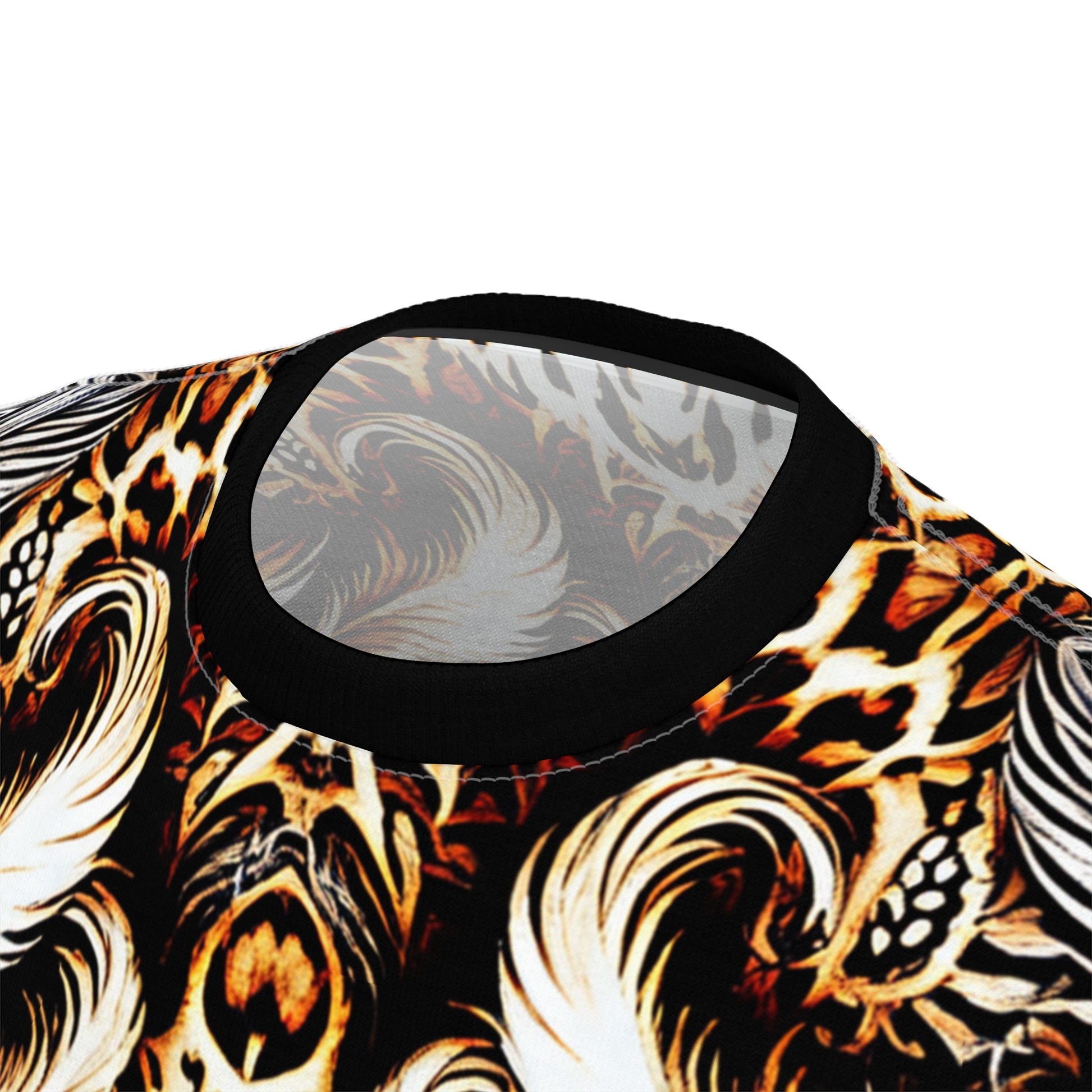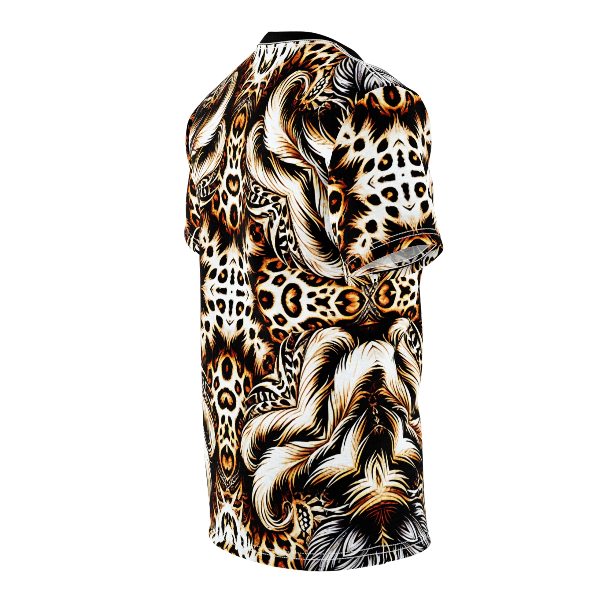 This all-over print tee brings a wild, kaleidoscopic energy to everyday wear. Rich leopard tones and flowing, fur-like swirls form a mirrored, almost tribal pattern that reads both bold and artful. Lightweight polyester keeps the print vibrant and the fit easy; wear it solo with dark jeans for nights out or layer it under a jacket for weekend markets and concerts. It feels adventurous — like slipping into a piece of wearable art that moves with you and draws conversation. For people who love statement prints and a little untamed flair, this tee slips seamlessly into festival days, city explorations, and creative gatherings.