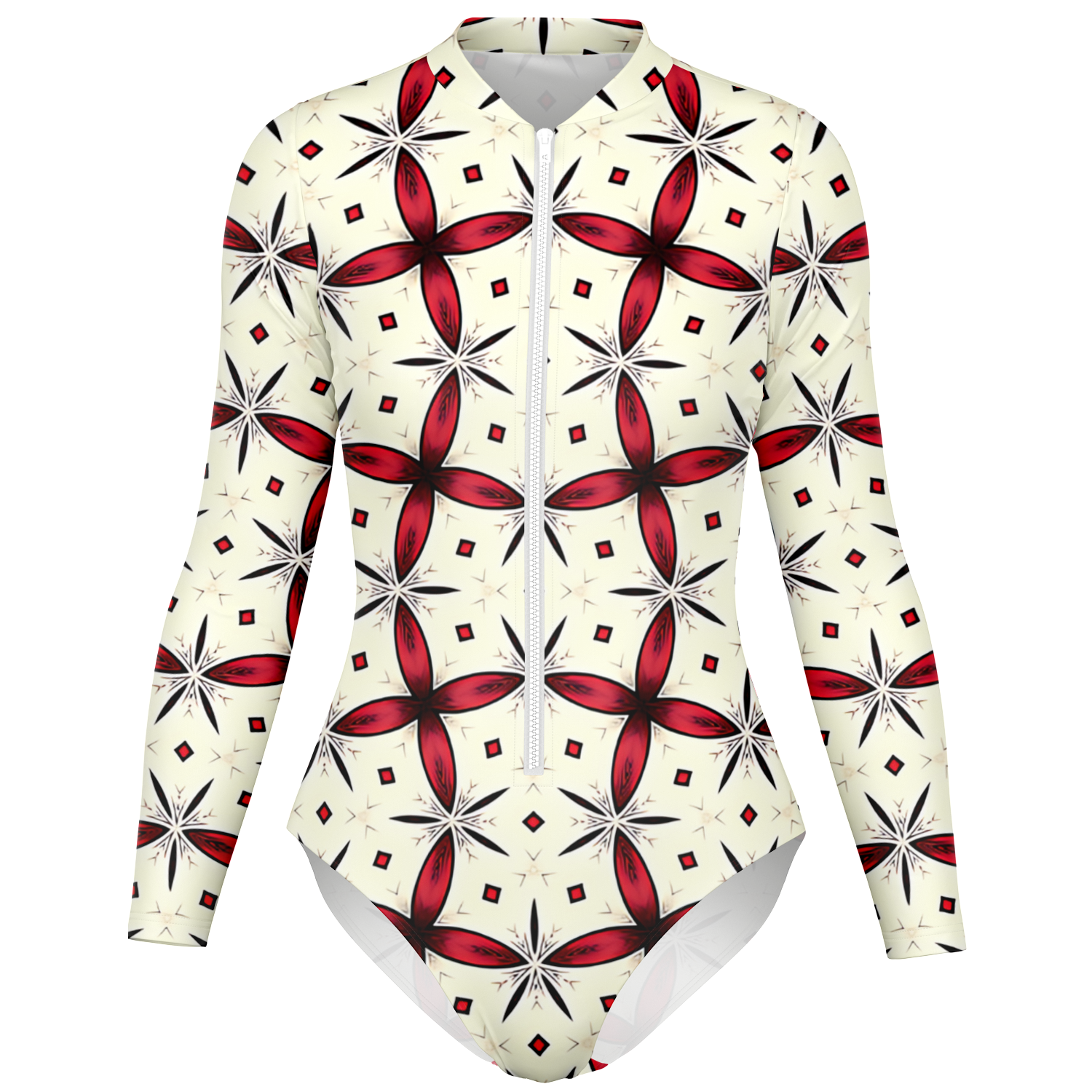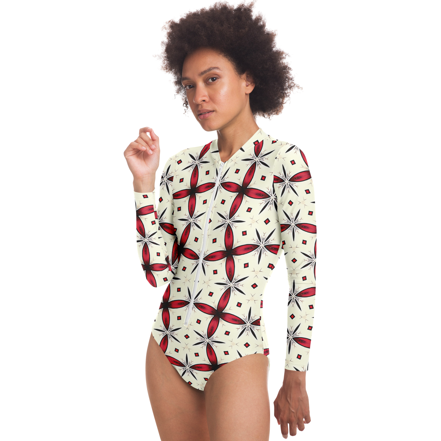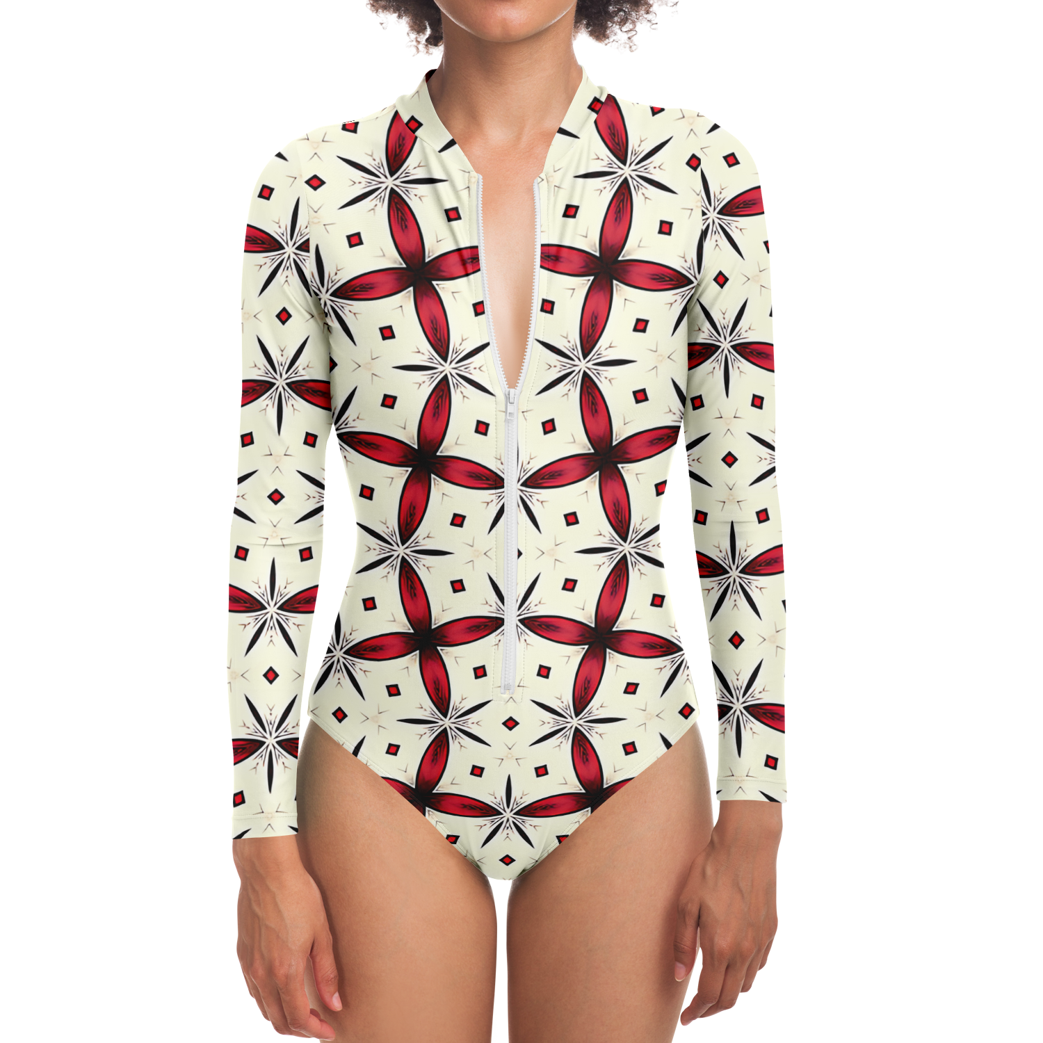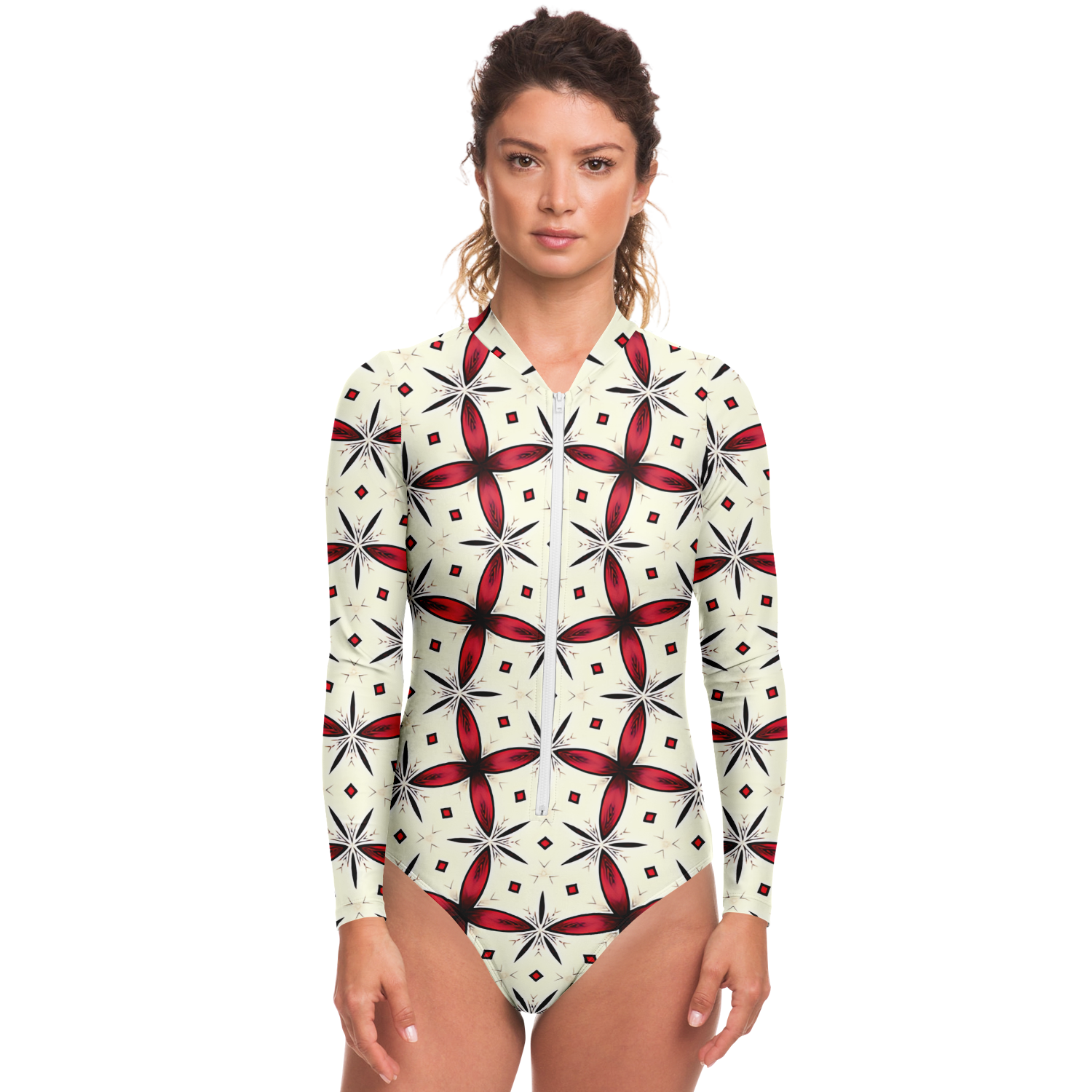 Women's Red & Black Geometric Pattern Bodysuit Long Sleeve